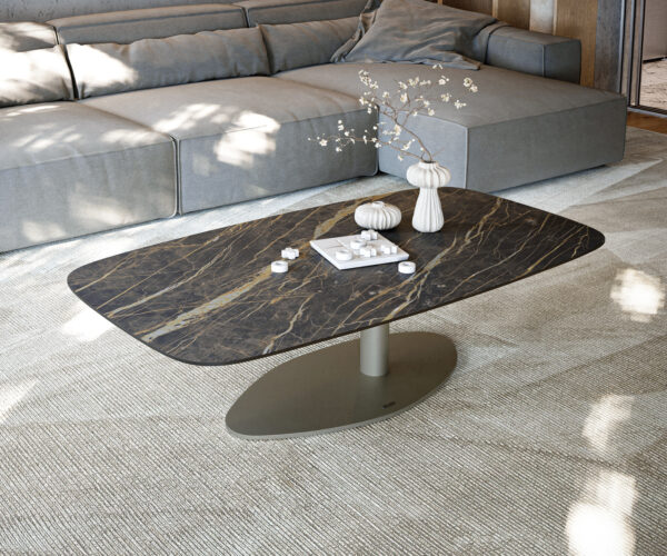 Tvůj nový vysněný stolek – konferenční stolek Edge z keramické desky Laminam® Noir Desir v hnědém odstínu v oválném tvaru