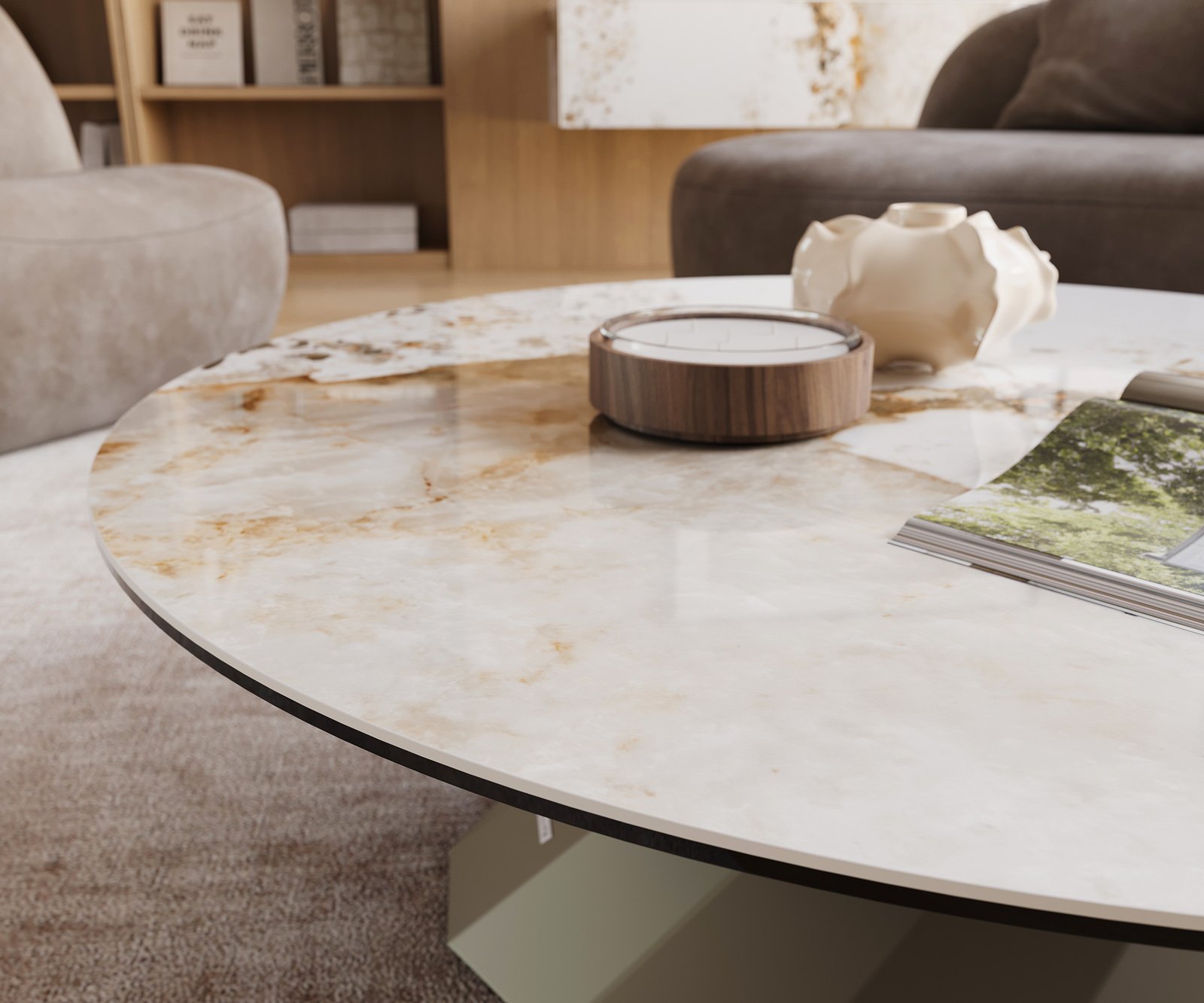 Úžasný konferenční stolek Edge ozdobí tvůj obývací pokoj. Je vyroben z kvalitní keramiky, která svým jedinečným barevným efektem v bílých a béžových odstínech připomíná vzácný mramor a díky pečlivě leštěnému povrchu rozzáří tvůj obývací pokoj. Keramika je zvláště známá svou odolností a pevností. Každý den tě nadchne svou snadnou údržbou. Díky kulatému tvaru se konferenční stolek Edge hodí nejen do menších prostor, ale také dokonale zvýrazní úžasné barevné provedení.