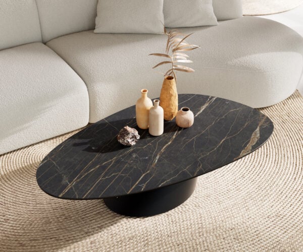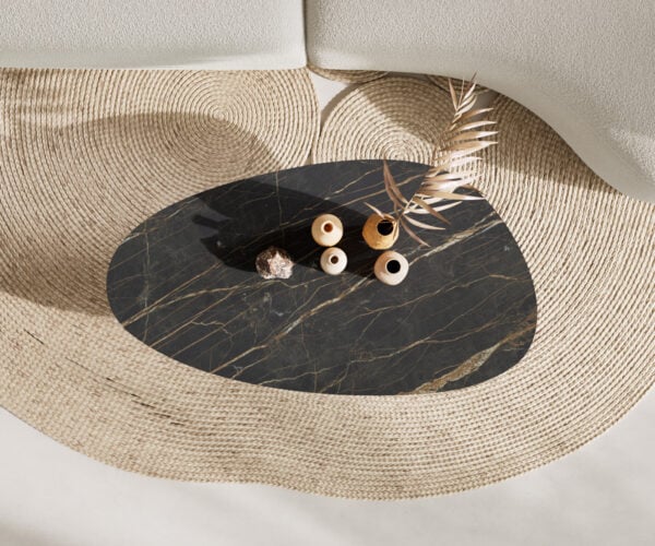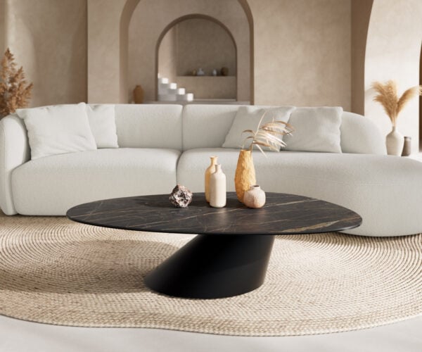 Elegantní konferenční stolek Edge zaujme svou impozantní oválnou deskou z pravé keramické Laminam® desky v elegantním hnědém odstínu Noir Desir. Je vysoce kvalitně zpracovaná a přesvědčuje svou odolností a dlouhou životností. Její strukturovaná kamenná textura zdůrazňuje jedinečnou krásu povrchu obzvlášť elegantně. Připomíná mohutný mramorový kámen protkán dechberoucím vlnitým vzorem, který se jemně rozlévá a vytváří nádherný obraz přirozené síly, harmonie a dynamiky.