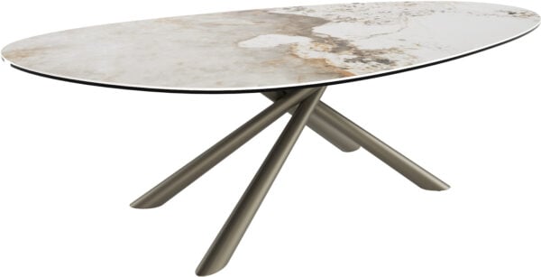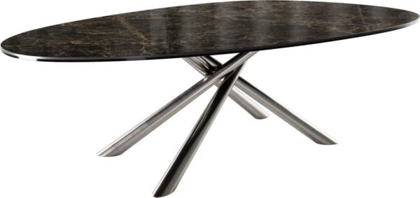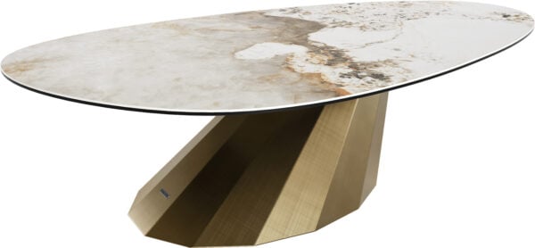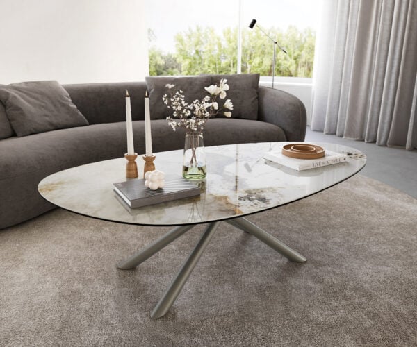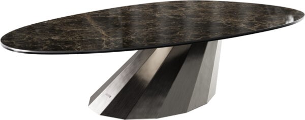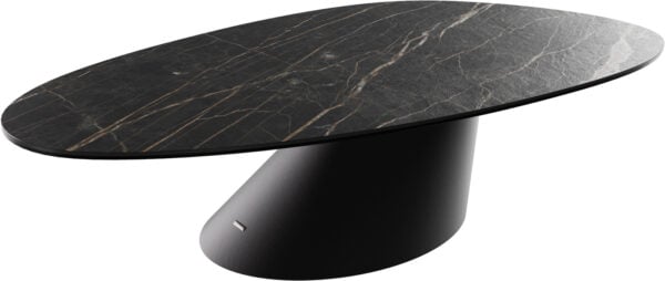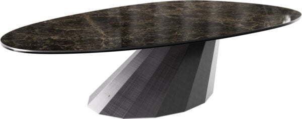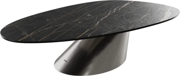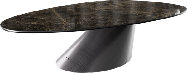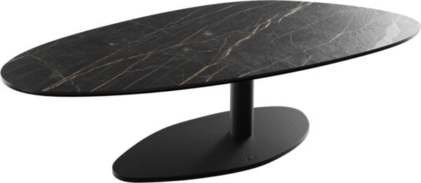 Oválná deska konferenčního stolku Edge z Laminam® keramiky s hladkou strukturou promění váš obývací pokoj v opravdové centrum dění. Vysoce kvalitní keramika z Itálie v příjemném hnědém odstínu Noir Desir se strukturovanou texturou není jen vizuálním lákadlem, ale je také známá svou odolností a pevností.