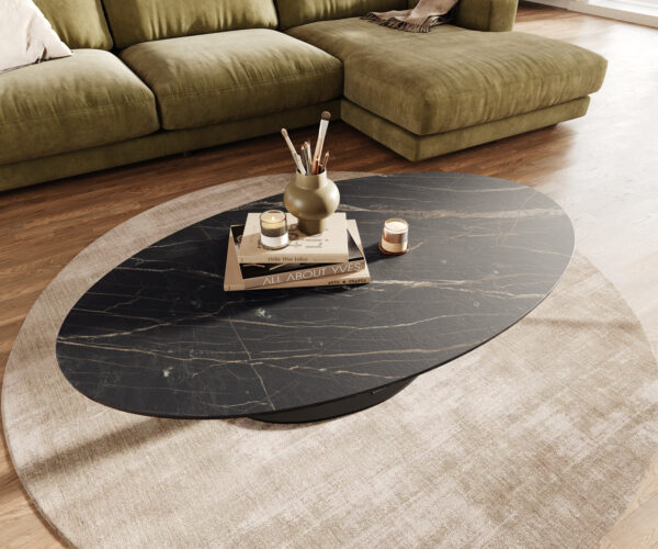 Impozantně elegantní – konferenční stolek Edge s oválnou deskou z Laminam® keramiky v hnědé barvě Noir Desir