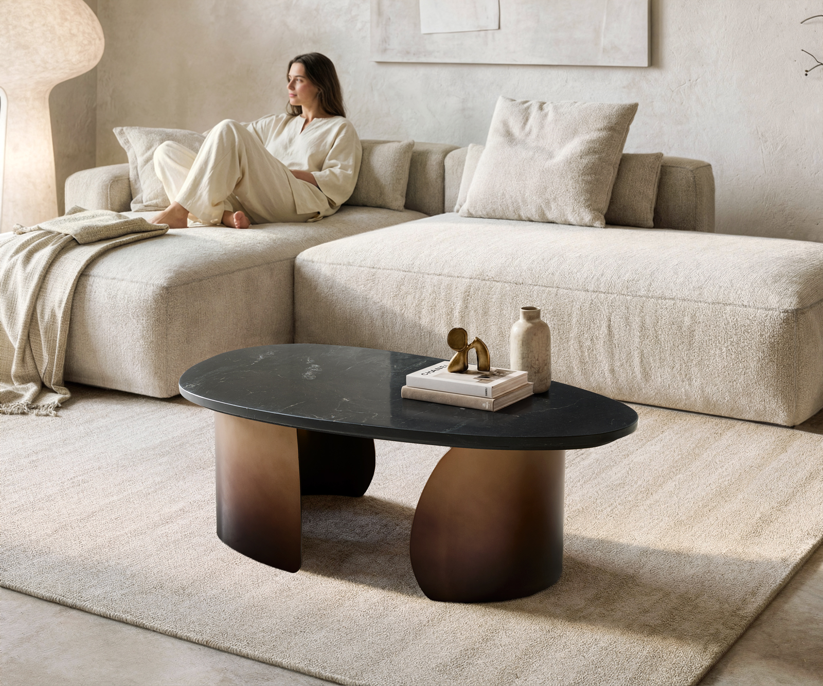 Marvello je konferenční stolek, který luxus nesděluje nahlas – ale dává ho najevo. Organicky tvarovaná mramorová deska v hluboké černé barvě je protkána zlatými žilkami a působí jako přírodní umělecké dílo vyzařující klid a rafinovanost. K tomu přistupuje zlatá kovová podnož s Fusion Finish: jemný přechod do černé, který designu dodává hloubku a světlo zachycuje fascinujícím způsobem.