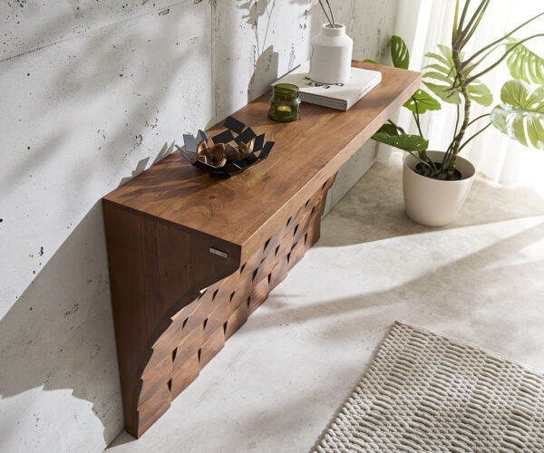 Kvalitní konzolový stůl je vyroben z masivního dřeva. Přírodní kresba akáciového dřeva podtrhuje jemný vzhled zakřivené komody. Všestranný a poutavý design ti umožní atraktivně vystavit květiny, figurky nebo jiné předměty – v jakékoli místnosti.
