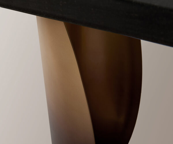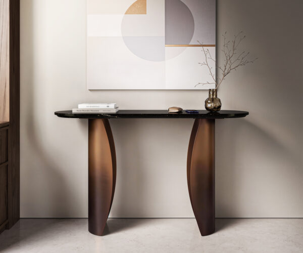 Solena je konzolový stůl, který vytváří první dojem. Oválná mramorová deska v černé barvě se stříbrnými žilkami působí jako elegantní umělecký objekt a dodává prostoru hloubku a charakter. Její jemné linie zdůrazňují elegantní siluetu a vnášejí lehkost do vstupní části. Zlatá kovová podnož s Fusion finish doplňuje kámen plynulým přechodem do černé a vytváří luxusní akcent.