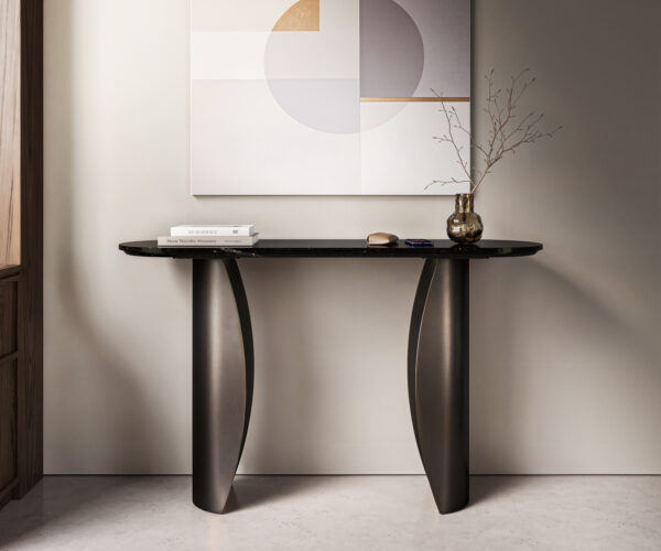 Solena v černo-stříbrné barvě s kovovou podnoží Black Antique představuje moderní interpretaci klasické elegance. Oválná mramorová deska působí jako elegantní objekt a dodává prostoru hloubku a výraz. Její přirozená kresba vytváří jemné akcenty, aniž by byla rušivá. Tmavá kovová podnož tvoří silný kontrast a zdůrazňuje čistý, architektonický vzhled konzolového stolku.
