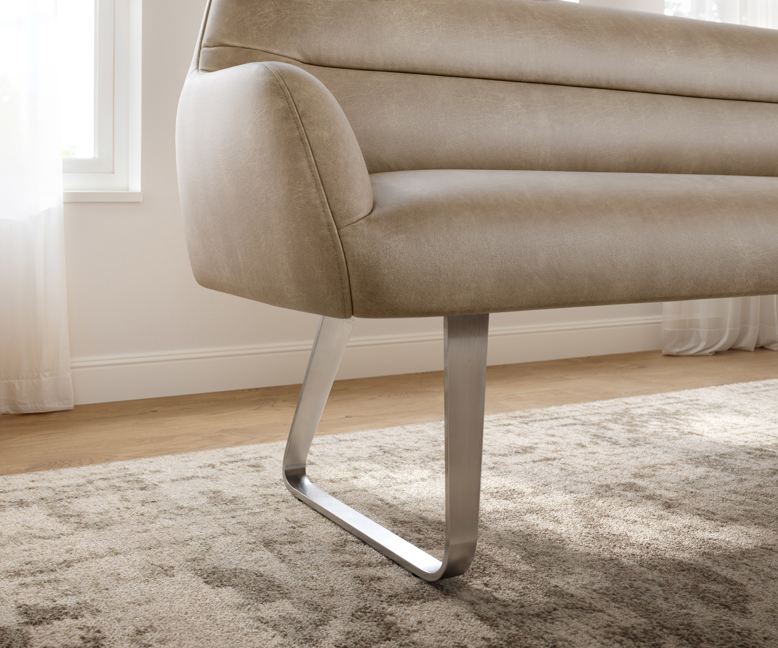 Nízká podnož ve tvaru lyžiny dodává jídelní lavici moderní a lehký vzhled. Šikmé, decentně zaoblené linie vytvářejí elegantní a otevřenou siluetu. Díky souvislému tvaru vzniká harmonická rovnováha mezi stabilitou a designem.