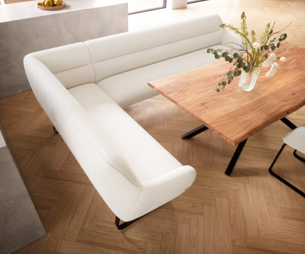 Nízký rám na tenkých nohách dodává jídelní lavici moderní, lehký vzhled. Šikmé, decentně zaoblené linie vytvářejí elegantní, otevřenou siluetu. Díky souvislému tvaru vzniká harmonická rovnováha mezi stabilitou a designem.