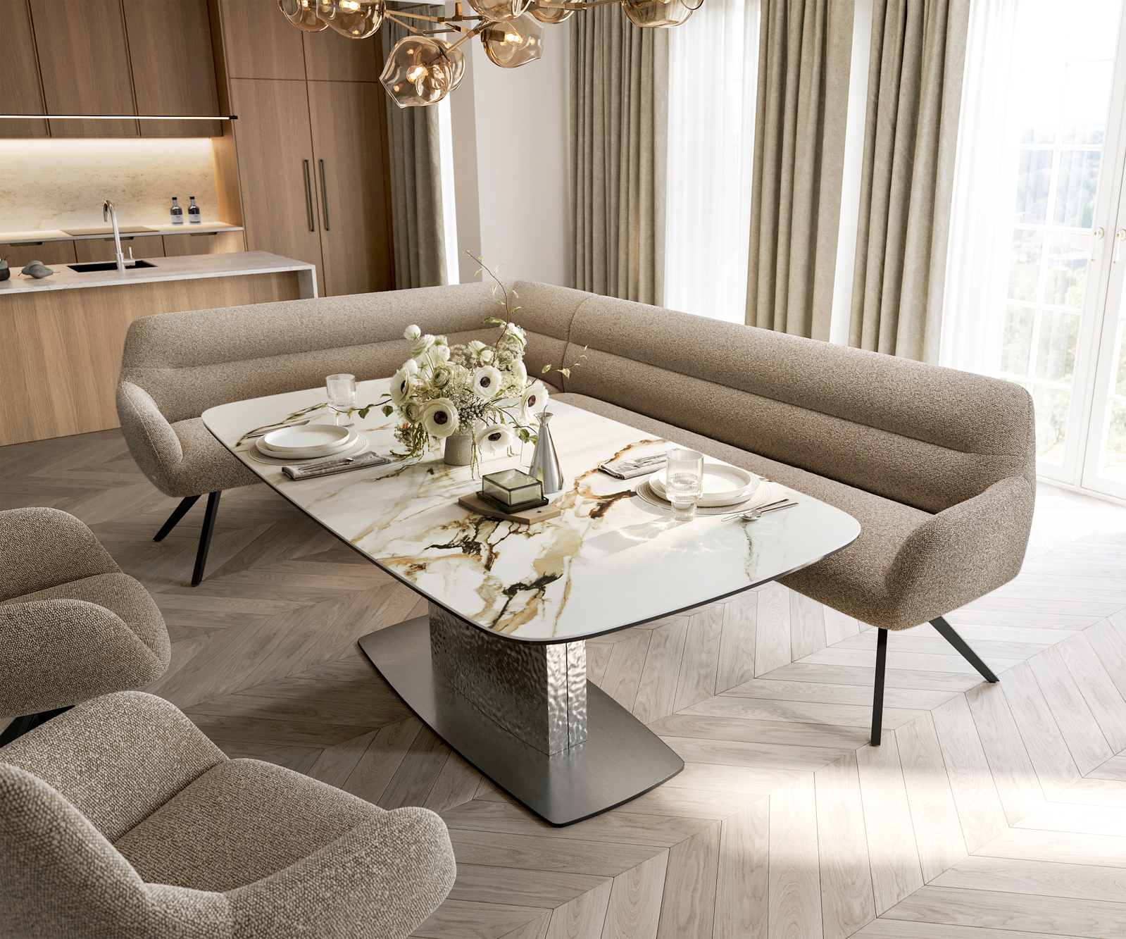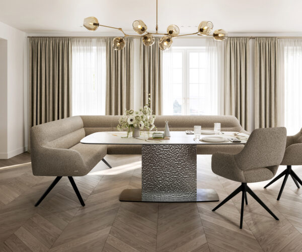 Jako součást našeho promyšleného systému lze rohovou lavici Taya ideálně kombinovat s našimi jídelními židlemi Flex a jídelními stoly Edge. Tvary, linie a rámy spolu dokonale ladí a vytvářejí harmonický celek v jídelně. Pro toto rohové řešení jsou obzvláště vhodné jídelní stoly Edge o délce 2 metry. K tomu doporučujeme jídelní židle Flex Yago, Zoa, Pejo, Heira nebo Xana, které si můžete na přání vybrat ve stejném potahu. Tak vznikne jídelní prostor, který vyjadřuje smysl pro styl – dokonale sladěný a plný charakteru.