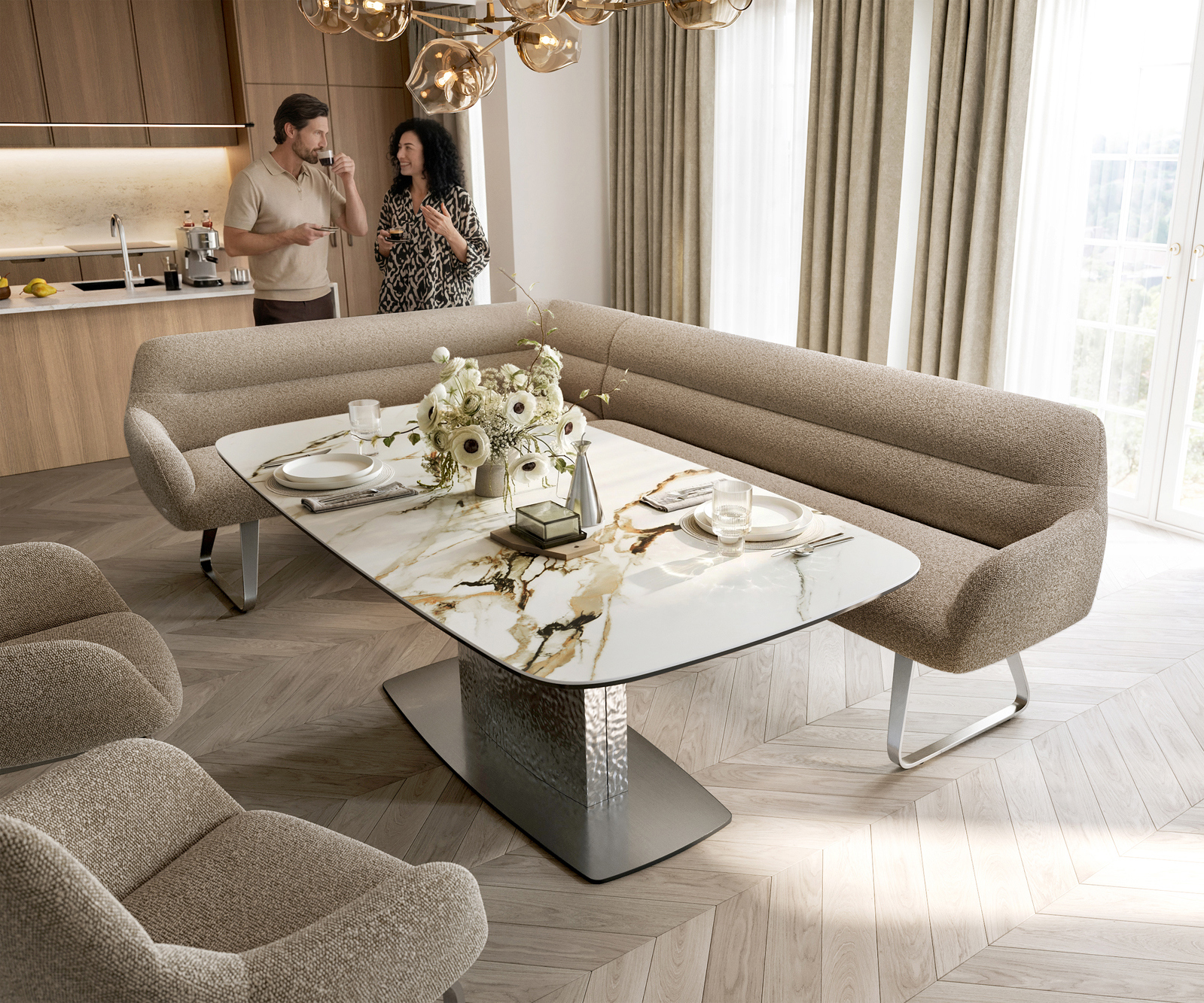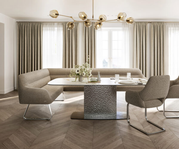 Jako součást našeho promyšleného systému lze rohovou lavici Taya ideálně kombinovat s našimi jídelními židlemi Flex a jídelními stoly Edge. Tvary, linie a rámy spolu dokonale ladí a vytvářejí harmonický celek v jídelním prostoru. Pro toto rohové řešení jsou obzvlášť vhodné jídelní stoly Edge o délce 2 metry. K tomu doporučujeme židle Flex Yago, Zoa, Pejo, Heira nebo Xana, které si můžete na přání vybrat ve stejném potahu. Tak vznikne jídelní prostor, který ukazuje smysl pro styl – dokonale sladěný a plný charakteru.