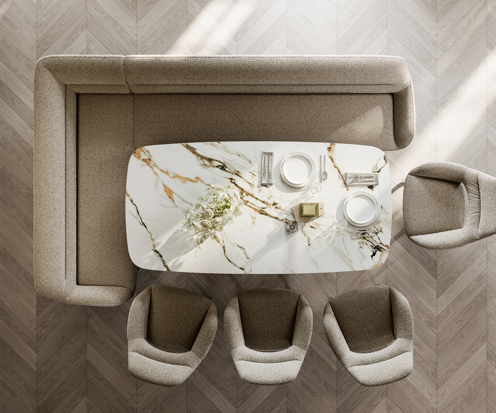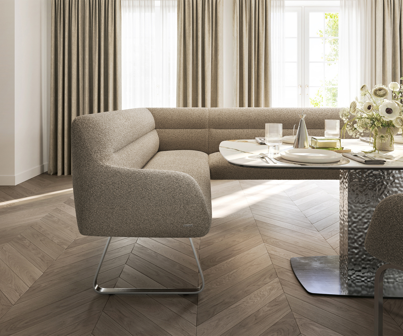 Luxusní bouclé látka v jemném tmavě béžovém odstínu zaujme svou výraznou strukturou a měkkým povrchem. Díky harmonickému barevnému ladění se materiál snadno začlení do různých interiérových konceptů a podtrhuje moderní a útulný charakter lavicového systému.