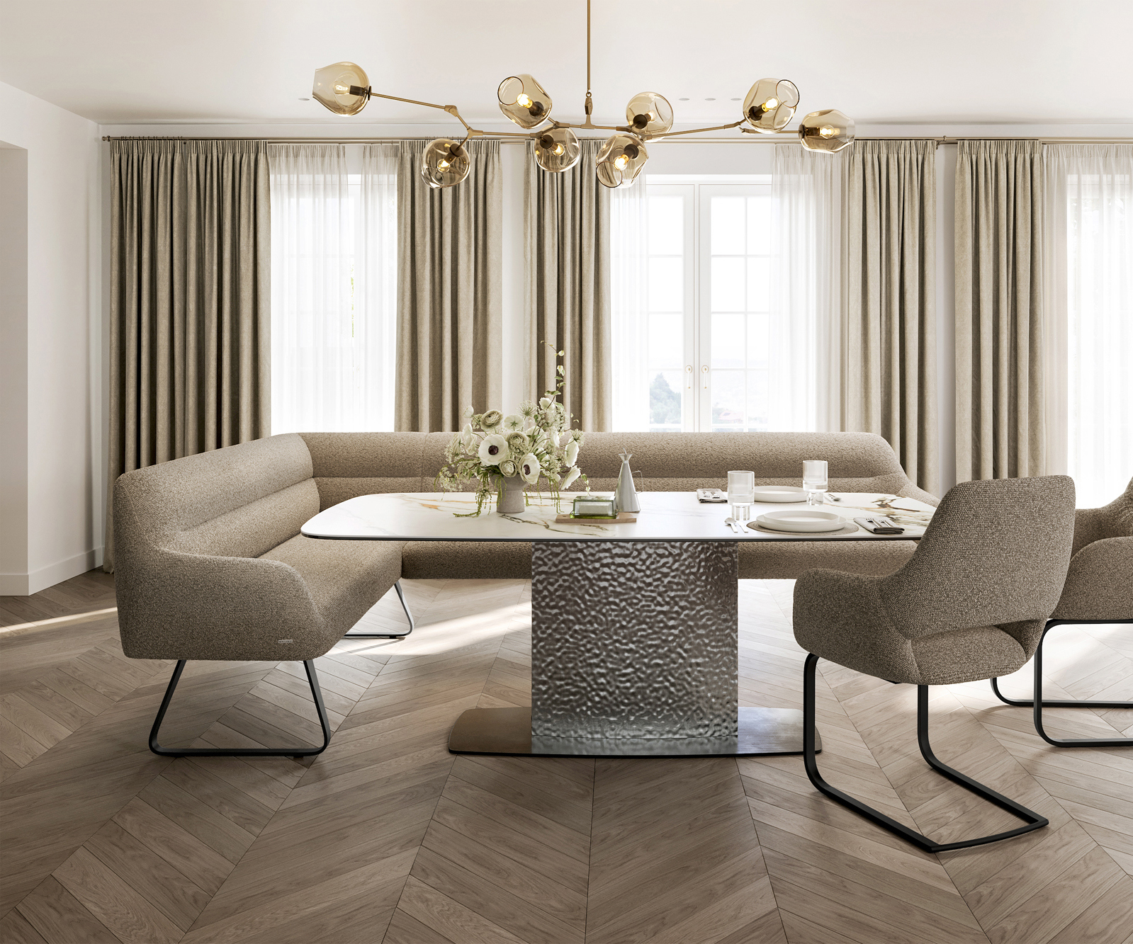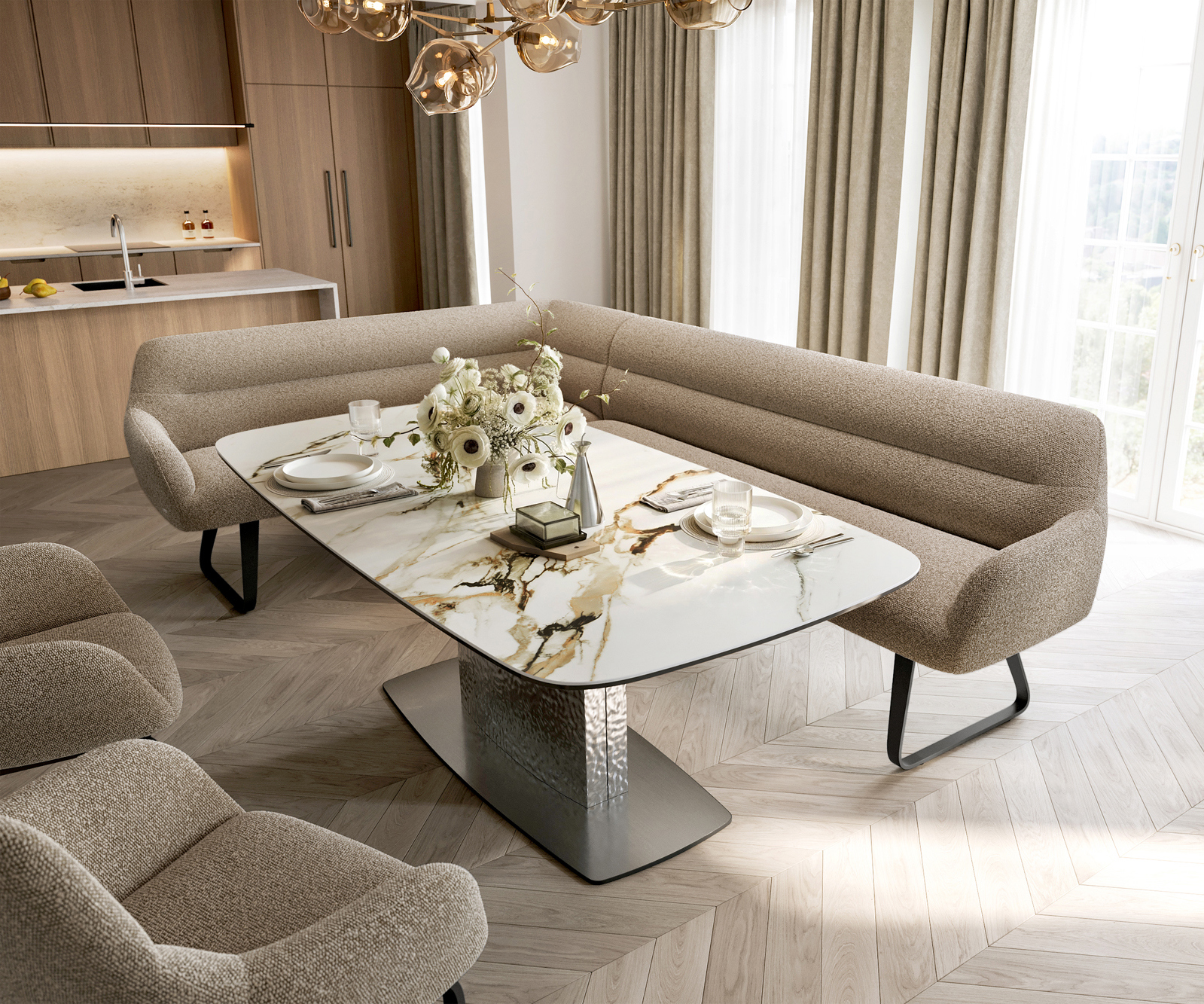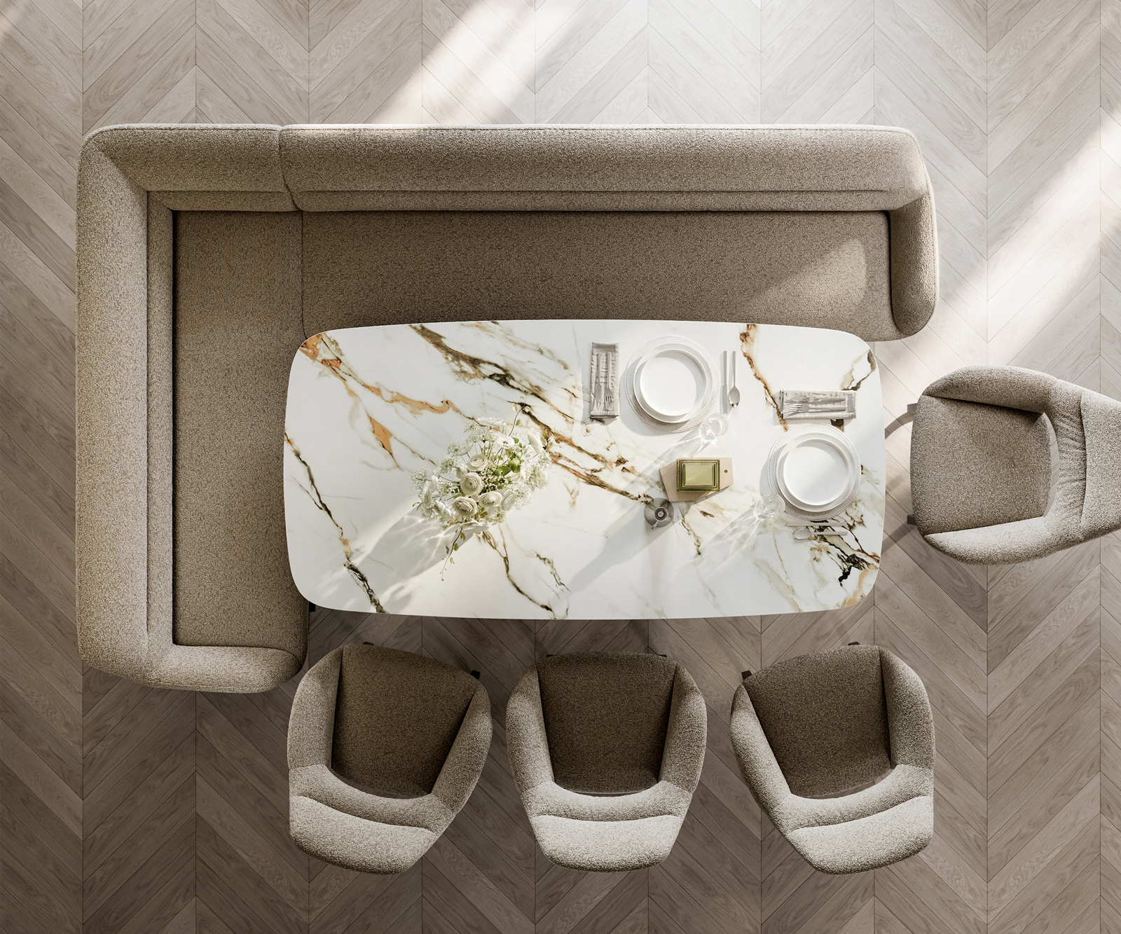 Ušlechtilá látka bouclé v jemném tmavě béžovém odstínu zaujme výraznou strukturou a měkkým povrchem. Díky harmonickému barevnému ladění se materiál snadno začlení do různých bytových konceptů a podtrhuje moderní, útulný charakter lavicového systému.