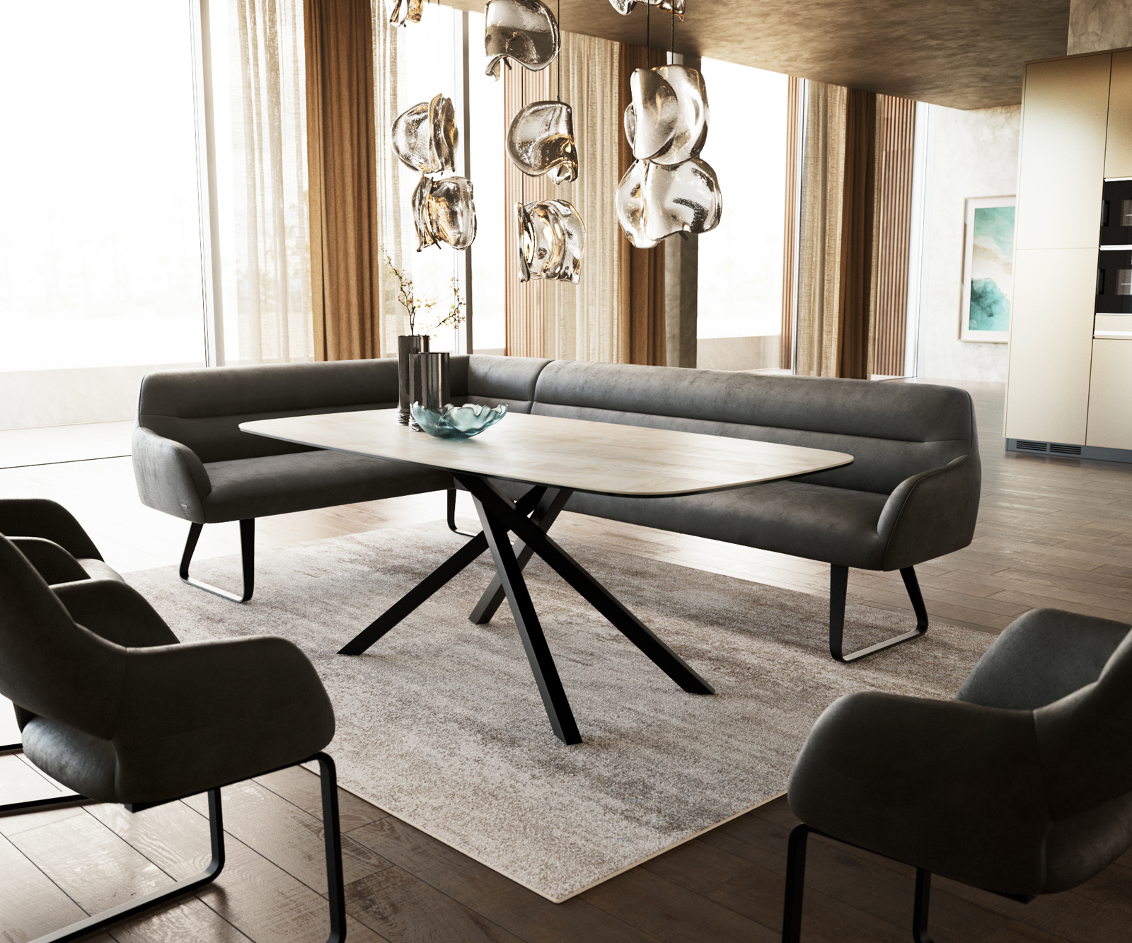 Plochý rám na tenkých nohách dodává jídelní lavici moderní a lehký vzhled. Šikmé, decentně zaoblené linie zajišťují elegantní a otevřenou siluetu. Díky souvislému tvaru vzniká harmonická rovnováha mezi stabilitou a designem.