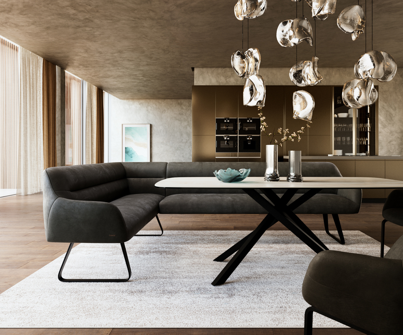 Jako součást našeho promyšleného systému lze rohovou lavici Taya ideálně kombinovat s našimi jídelními židlemi Flex a jídelními stoly Edge. Tvary, linie a rámy spolu dokonale ladí a vytvářejí harmonický celek v jídelně. Pro toto rohové řešení jsou obzvlášť vhodné jídelní stoly Edge o délce 2 metry. K tomu doporučujeme židle Flex Yago, Zoa, Pejo, Heira nebo Xana, které si můžete na přání vybrat v identickém potahu. Tak vznikne jídelní prostor, který ukazuje smysl pro styl – dokonale sladěný a plný charakteru.
