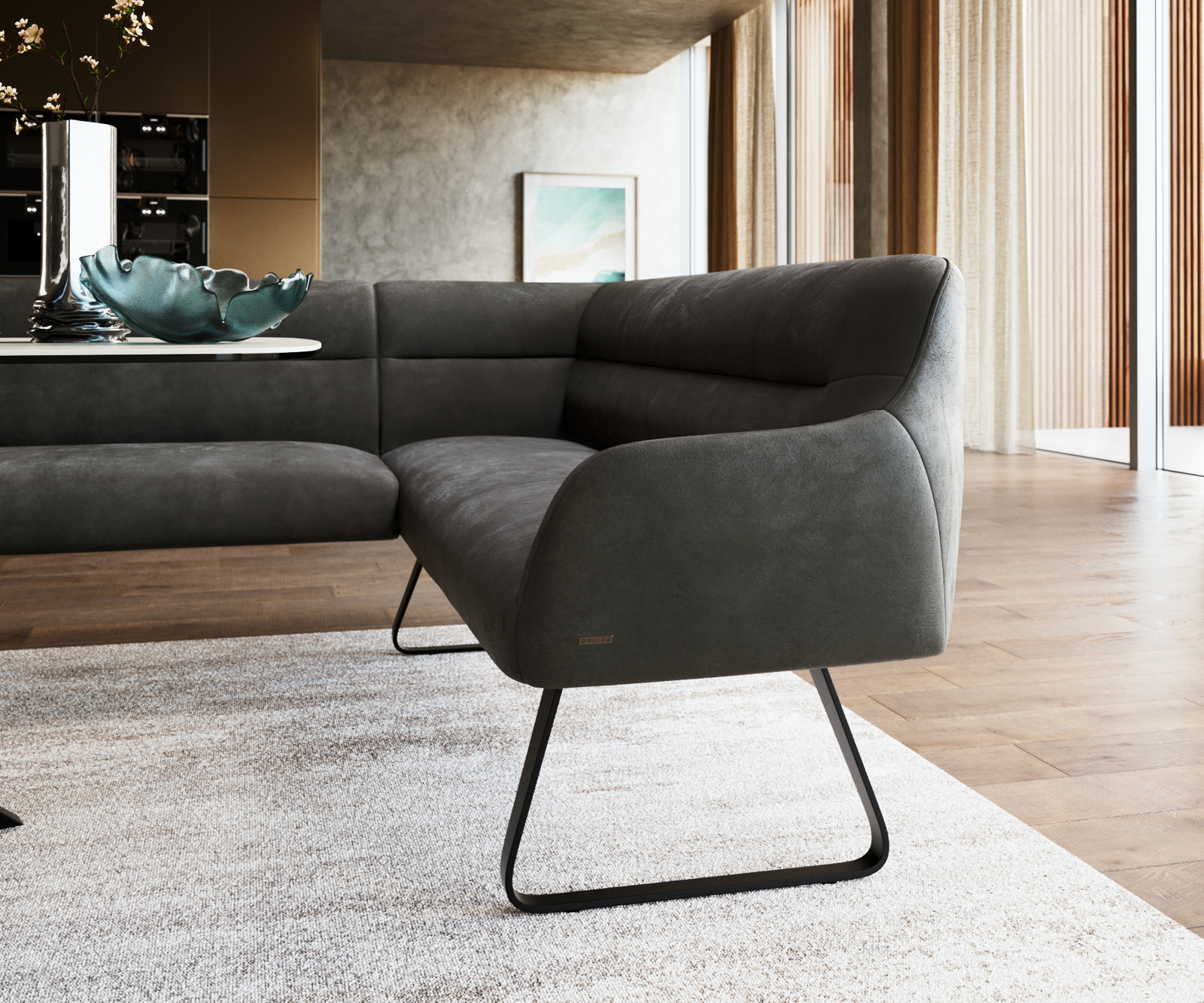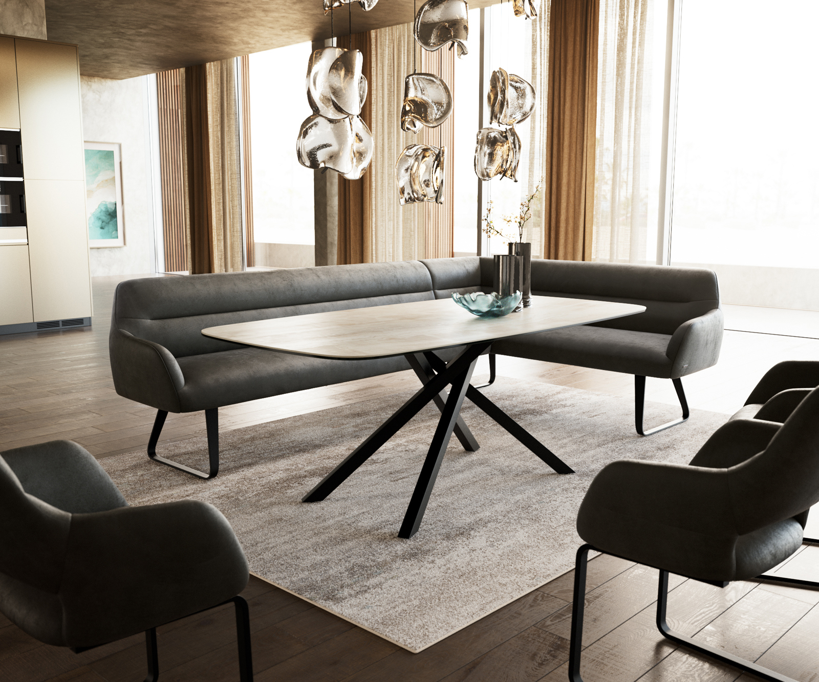 Plochý rám na tenkých nohách dodává jídelní lavici moderní a lehký vzhled. Šikmé, decentně zaoblené linie zajišťují elegantní a otevřenou siluetu. Díky souvislému tvaru vzniká harmonická rovnováha mezi stabilitou a designem.