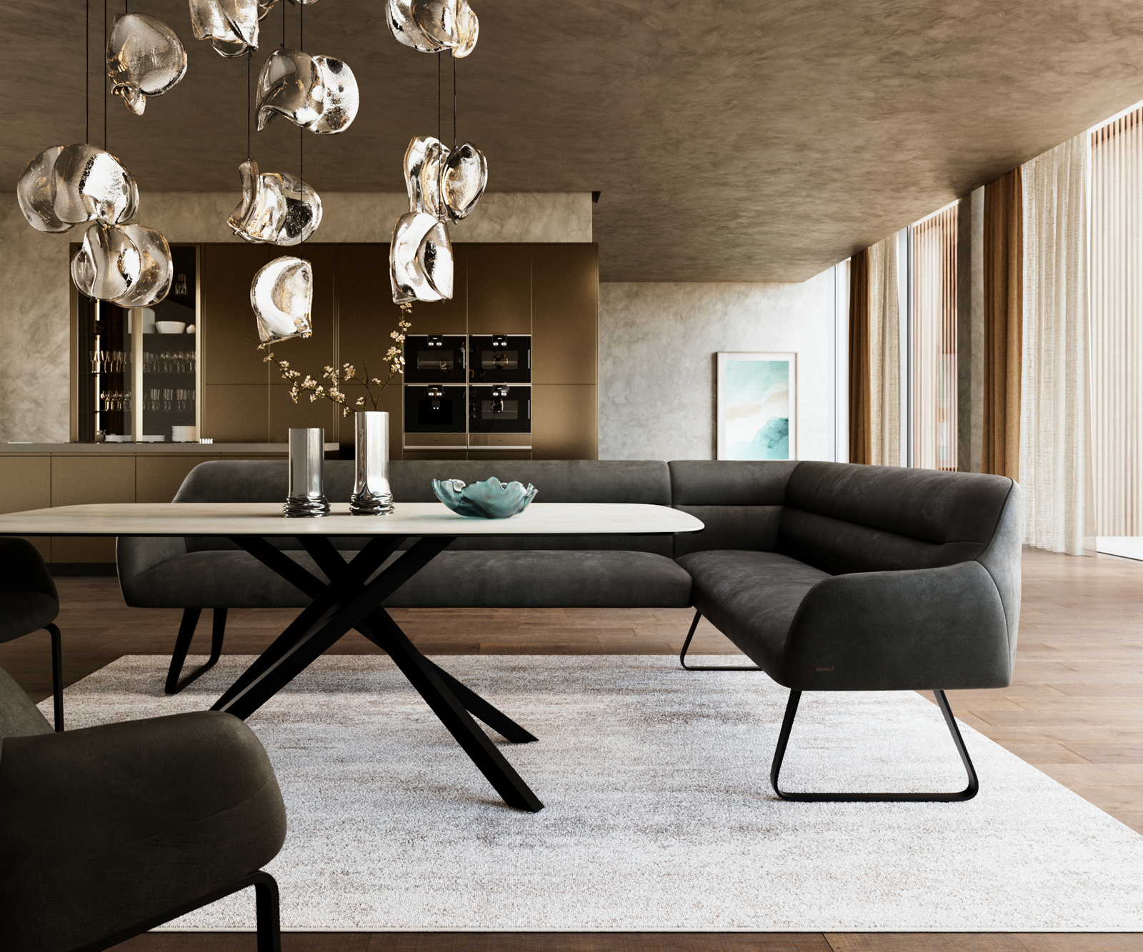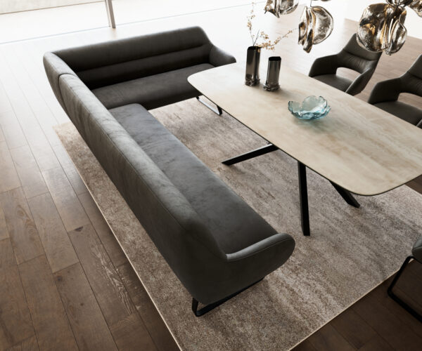 Jako součást našeho promyšleného systému lze rohovou lavici Taya ideálně kombinovat s našimi jídelními židlemi Flex a jídelními stoly Edge. Tvary, linie a rámy spolu dokonale ladí a vytvářejí harmonický celek v jídelně. Pro toto rohové řešení jsou obzvlášť vhodné jídelní stoly Edge o délce 2 metry. K tomu doporučujeme židle Flex Yago, Zoa, Pejo, Heira nebo Xana, které si můžete na přání vybrat v identickém potahu. Tak vznikne jídelní prostor, který ukazuje smysl pro styl – dokonale sladěný a plný charakteru.