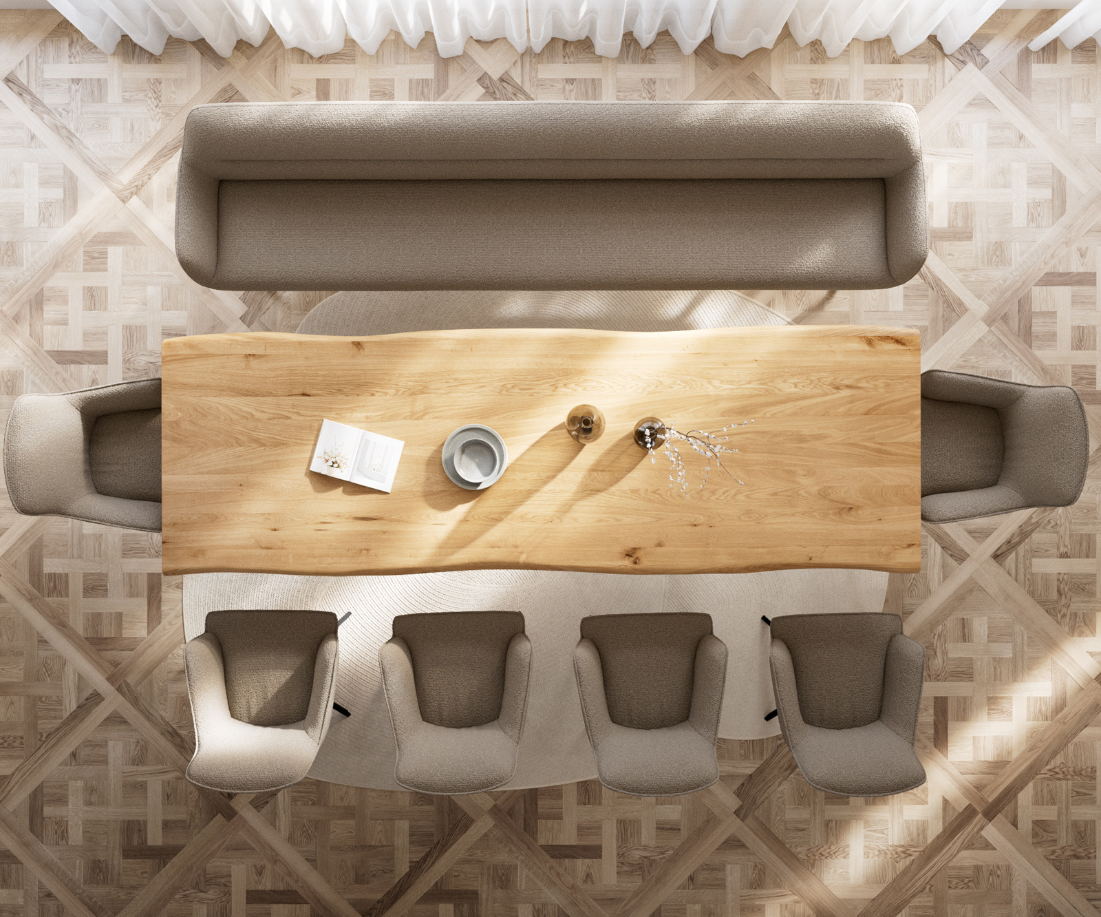 Naše jídelní židle Flex a jídelní stoly Edge dokonale navazují na design lavice: tvary, linie a podnože spolu harmonicky ladí. Jídelní stoly Edge o délce 3 metry jsou na to optimálně přizpůsobeny. K tomu doporučujeme jídelní židle Flex Yago, Zoa, Pejo, Heira nebo Xana, které můžete na přání zvolit ve stejném potahu. Tak vznikne jídelní prostor, který ukazuje smysl pro styl – dokonale sladěný a plný charakteru.