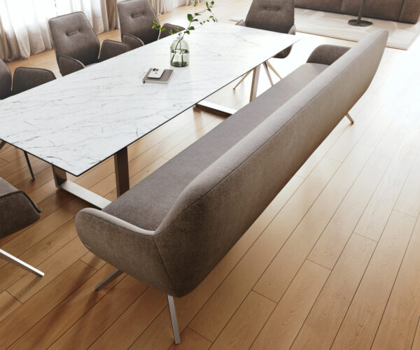 Naše jídelní židle Flex a jídelní stoly Edge perfektně navazují na design lavice: tvary, linie a podnože spolu harmonicky ladí. Jídelní stoly Edge o délce 3 metry jsou na to optimálně přizpůsobeny. K tomu doporučujeme jídelní židle Flex Yago, Zoa, Pejo, Heira nebo Xana, které si můžete na přání vybrat ve stejném potahu. Tak vznikne jídelní prostor, který vyjadřuje smysl pro styl – dokonale sladěný a plný charakteru.