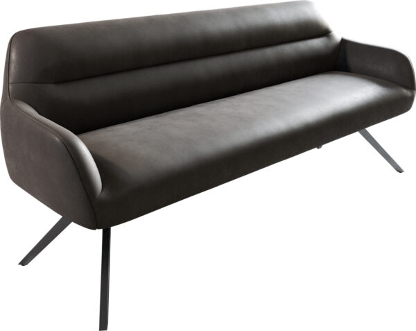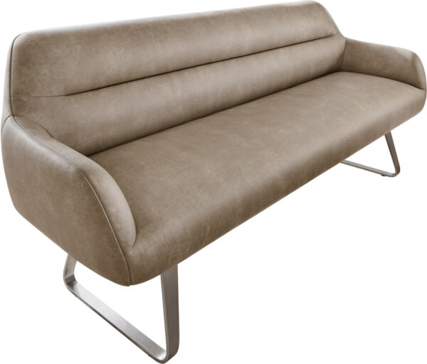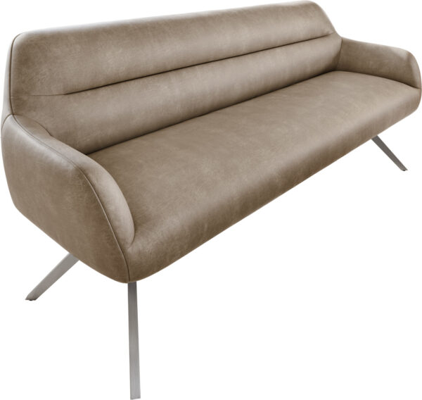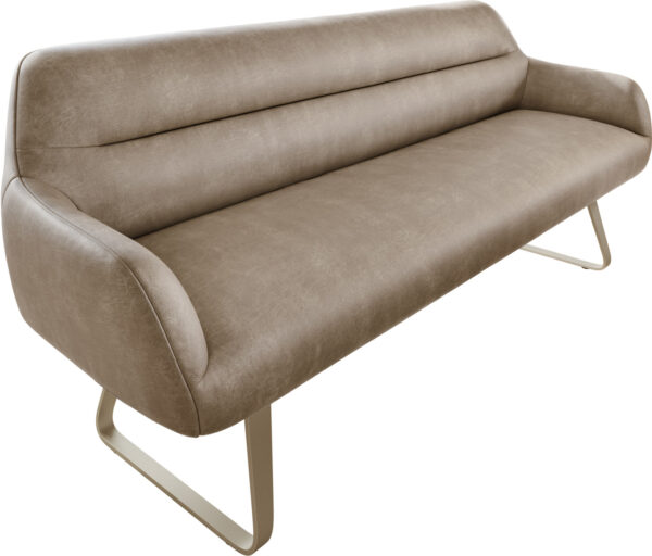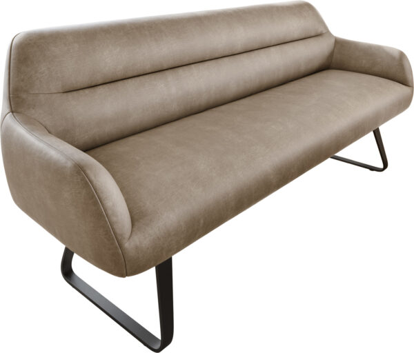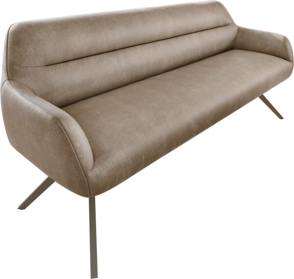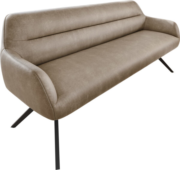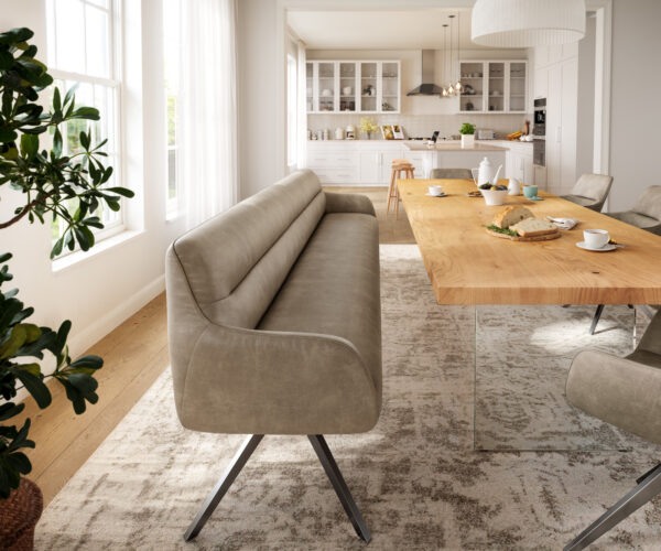 Jídelní lavice Taya zaujme jemným tvarem a precizně zpracovaným lemováním, které zdůrazňuje jemně zakřivené linie. Uvnitř zajišťuje vysoce kvalitní sendvičová konstrukce z pěny (RG 40 kg/m³) v kombinaci s taštičkovými pružinami a vlnitou podložkou výjimečný komfort sezení a dlouhotrvající tvarovou stálost. Opěradlo a sedák jsou vyrobeny jako jeden souvislý čalouněný prvek, což lavici dodává klidný a kvalitní vzhled. Speciálně vyvinutá kovová podnož nabízí mimořádnou stabilitu a nevyžaduje žádné viditelné podpěry – inovativní řešení, které spojuje volně zavěšený design s spolehlivou stabilitou.