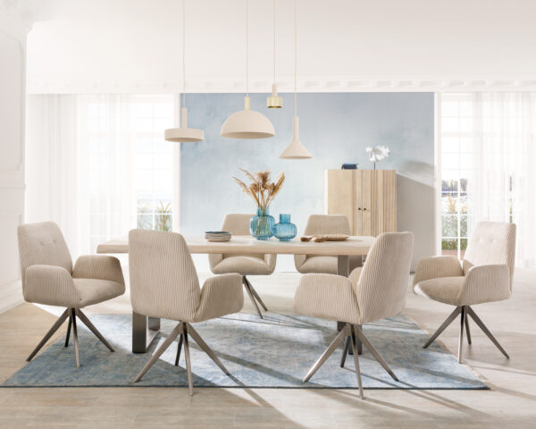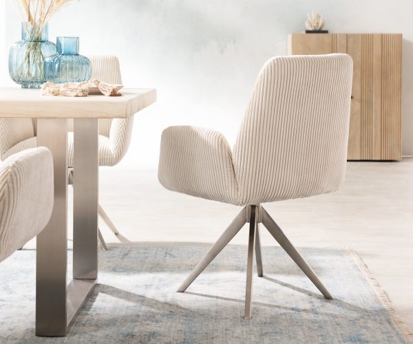 Židle je potažena módní manšestrovou látkou v teplém béžovém odstínu. Je velmi příjemná na dotek, zároveň však mimořádně odolná a snadno udržovatelná.