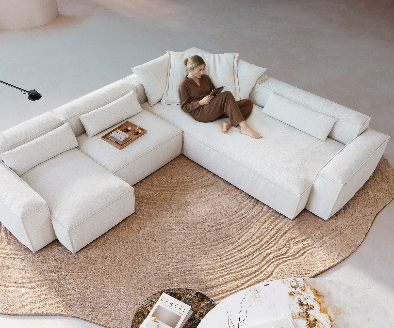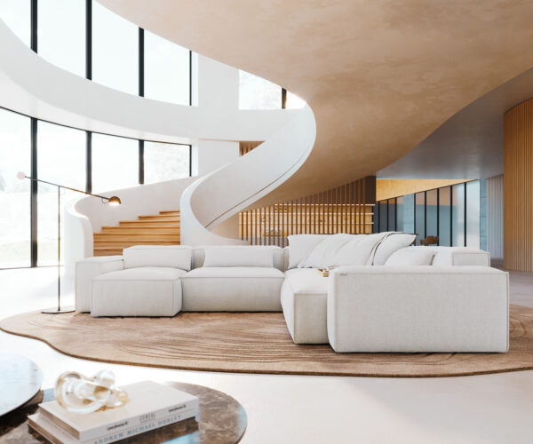 Pohovka ve tvaru „U“ Freestyle není jen pohovka, kterou si jednoduše koupíš – je to ta, kterou si sám vytvoříš. Díky příjemně měkkému Bouclé Soft Beige a charakteristickému povrchu určuje lemování celkový dojem: šikovně olemovaná kontura vytváří jemné akcenty a dává pohovce hodnotnou, klasicky elegantní linii. Tak vzniká útočiště, které do tvého domova přináší teplo a klid.