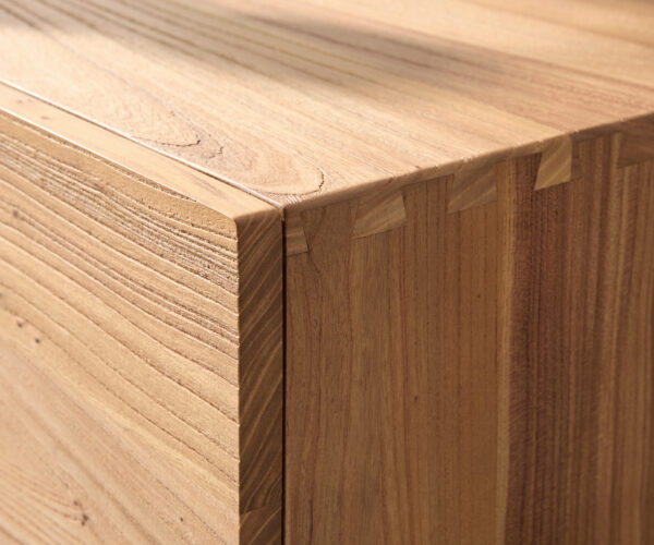 Komoda Tiamar přináší do vašeho domova moderní vzhled díky svému přirozenému kouzlu a propracovaným detailům. Vyrobena z jilmového dřeva v teplém přírodním odstínu, vyzařuje nadčasovou eleganci. Přední část tvoří dvě dvojice zásuvek různých šířek a jedno dvířko, což vytváří harmonickou kombinaci symetrie a napětí. Prodloužená úchytka je nenápadně začleněna do designu a umožňuje pohodlné otevírání a zavírání.