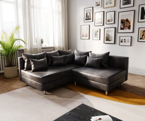 Rohová pohovka Clovis v antickém antracitu je modulárně rozšiřitelná