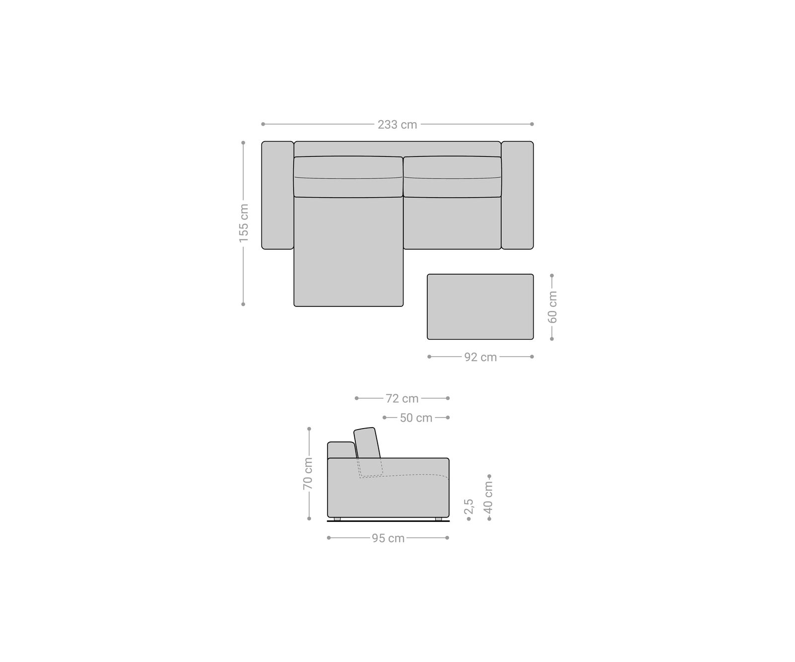 - Rozměry cca: Š233 × H155 × V70 cm