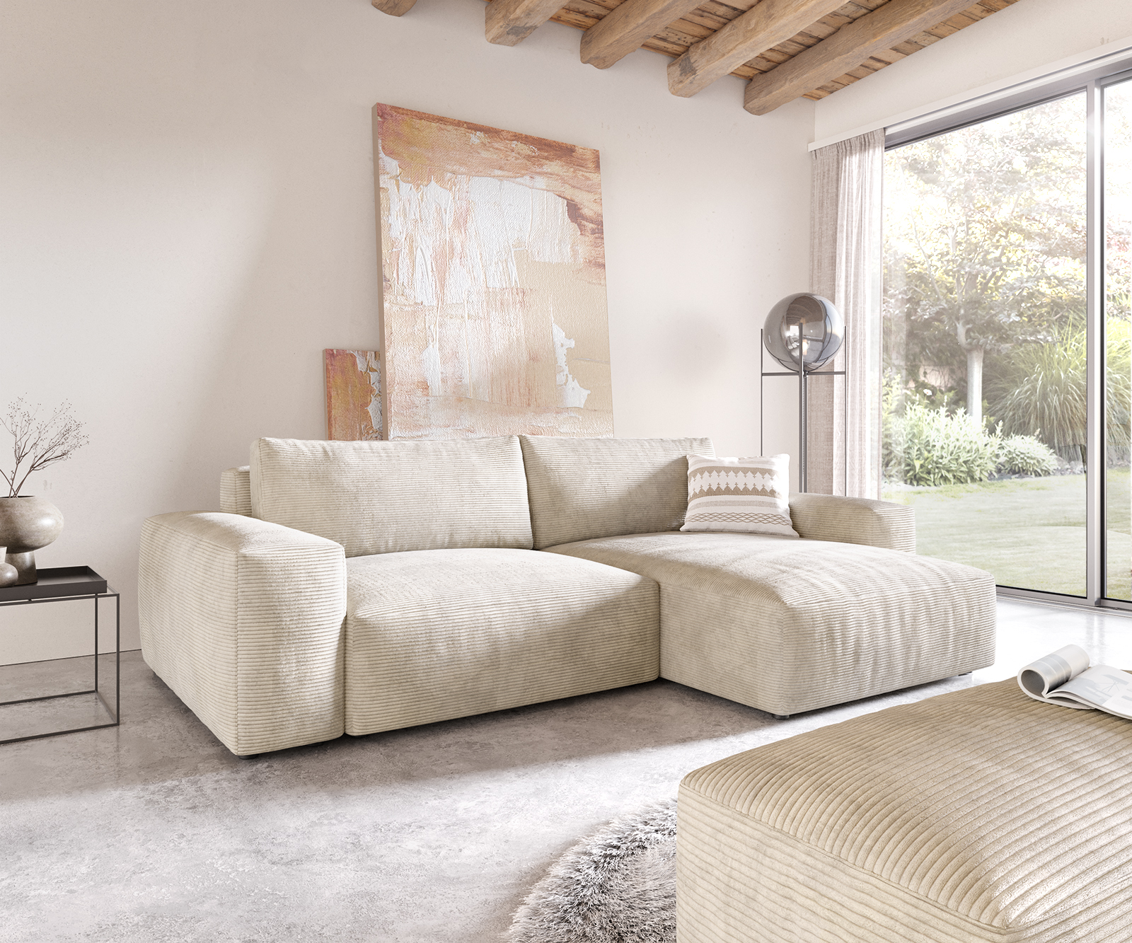 Prostorná rohová pohovka je potažena módní, obzvlášť příjemnou látkou manšestr a díky svému teplému béžovému odstínu vytváří příjemnou a přátelskou atmosféru. Lze ji variabilně umístit a bez problémů se přizpůsobí vaší prostorové situaci. Měkké čalounění s kvalitním pružinovým jádrem dělá z Lanzo pohodlnou pohovku nejvyšší třídy a absolutní centrum vašeho domova.