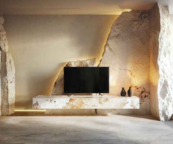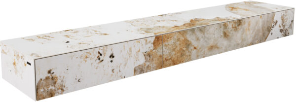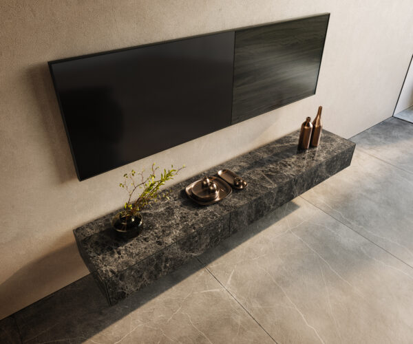Slavná italská keramika Laminam® zachycuje ušlechtilý půvab tmavého mramoru v syté hloubce a působivé kvalitě. Jemně plynoucí barevné přechody a citlivá kresba dřeva dodávají designu CUOR výraznou, téměř magnetickou přítomnost – plnou elegance a charakteru. Pro ještě působivější efekt je nábytek pevně připevněn přímo na stěnu. Závěsný vzhled přináší lehkost a obzvlášť harmonický vzhled.
