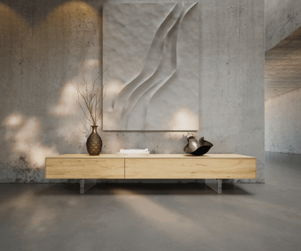 Vzácná keramika Laminam® z Itálie – synonymum nadčasové elegance a mimořádné odolnosti – u tohoto TV stolku ze série CUOR naplno rozvíjí svůj výraz. Teplé barevné odstíny připomínající dřevěné tóny, inspirované jemnou pískovou paletou benátské laguny a charakterem vzácného dubu, se spojují s plynulou kresbou dřeva v harmonický celek. Tato mistrovská hra barev a struktury dává CUOR nezaměnitelnou hloubku, která činí tento ikonický design nezapomenutelným. Jemné nohy z pevného a průhledného akrylátu propůjčují nábytkovému designu závěsný vzhled a elegantní lehkost.
