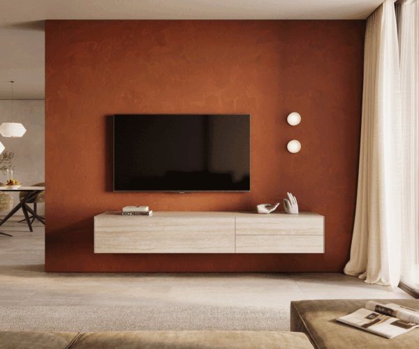 Jemné bílé a krémové odstíny protkávané jemnou kresbou dodávají TV stolku CUOR z pravé italské Laminam® keramiky auru nadčasové a přívětivé elegance, která evokuje světlý travertinový kámen z jižní Evropy. Měkké lískové tóny a barevné přechody se harmonicky spojují a dodávají ikonickému designu CUOR lehkost a působivou rafinovanost. Pro ještě působivější efekt je nábytek pevně připevněn přímo na zeď stabilním držákem. Závěsný vzhled přináší lehkost a zvlášť harmonický vzhled.