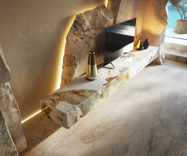 Měkké béžové a bílé odstíny dodávají TV stolku CUOR jedinečnou estetiku plnou hloubky a intenzity. Hightech keramika rozvíjí elegantní hru plynule harmonických barevných přechodů a vzácného žilkování. Podtrhuje ikonický design CUOR – silný, živý a s nadčasovým charisma. Pro ještě působivější efekt je nábytek upevněn pevnou montáží přímo na stěnu. Závěsný vzhled přináší lehkost a zvlášť harmonický vzhled.