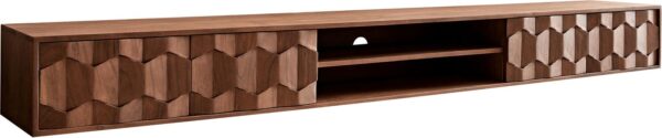 Akáciové dřevo s jemnou kresbou, upravené matným hnědým odstínem, vyzařuje elegantní dojem. Prostorný TV stolek o délce 240 cm zaujme kombinací otevřeného a uzavřeného úložného prostoru.