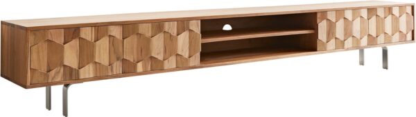 Přírodní akáciové dřevo září v teplém odstínu a zaujme jedinečnou kresbou dřeva. Prostorný 240 cm TV stolek přesvědčí kombinací otevřeného a uzavřeného úložného prostoru.