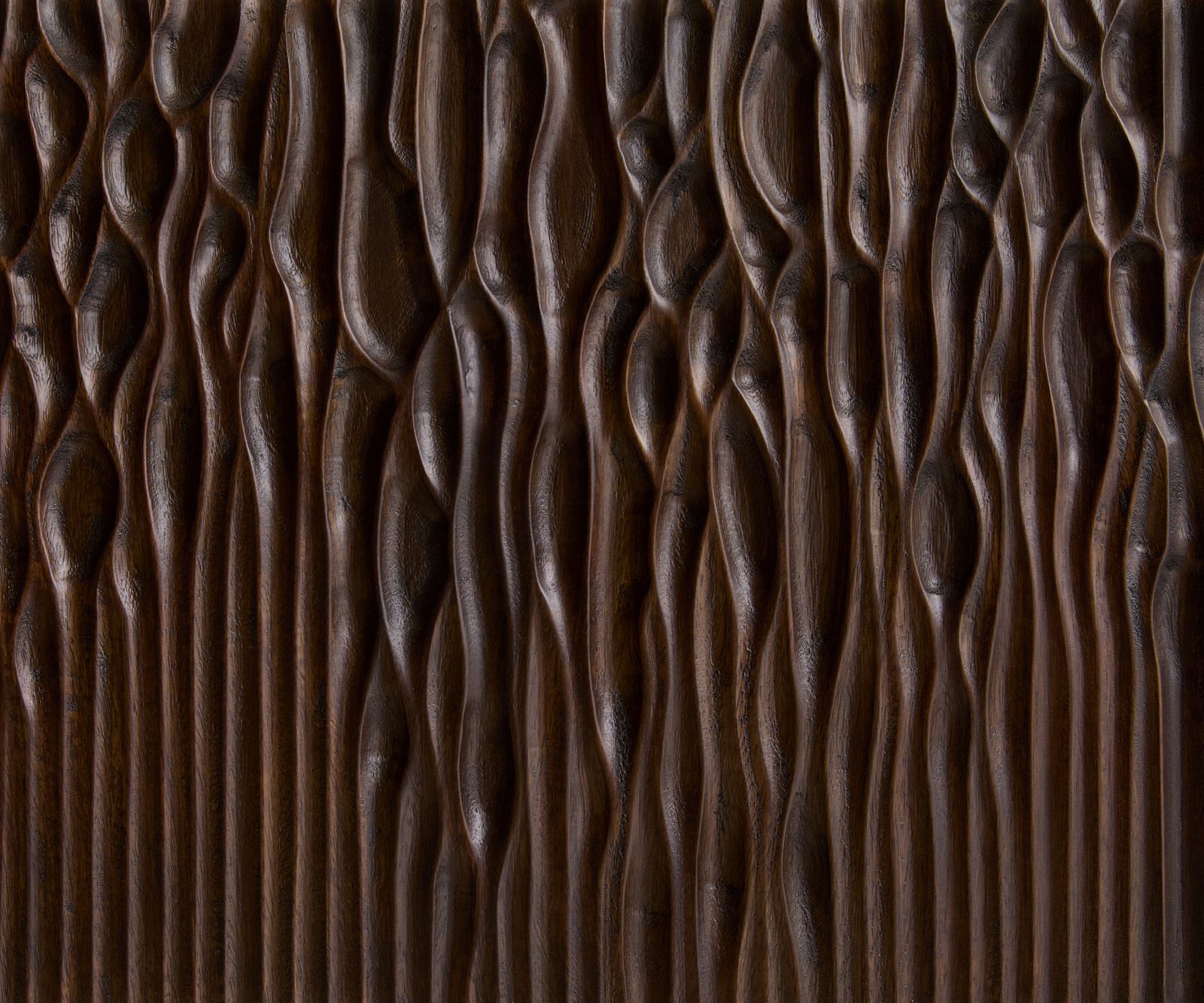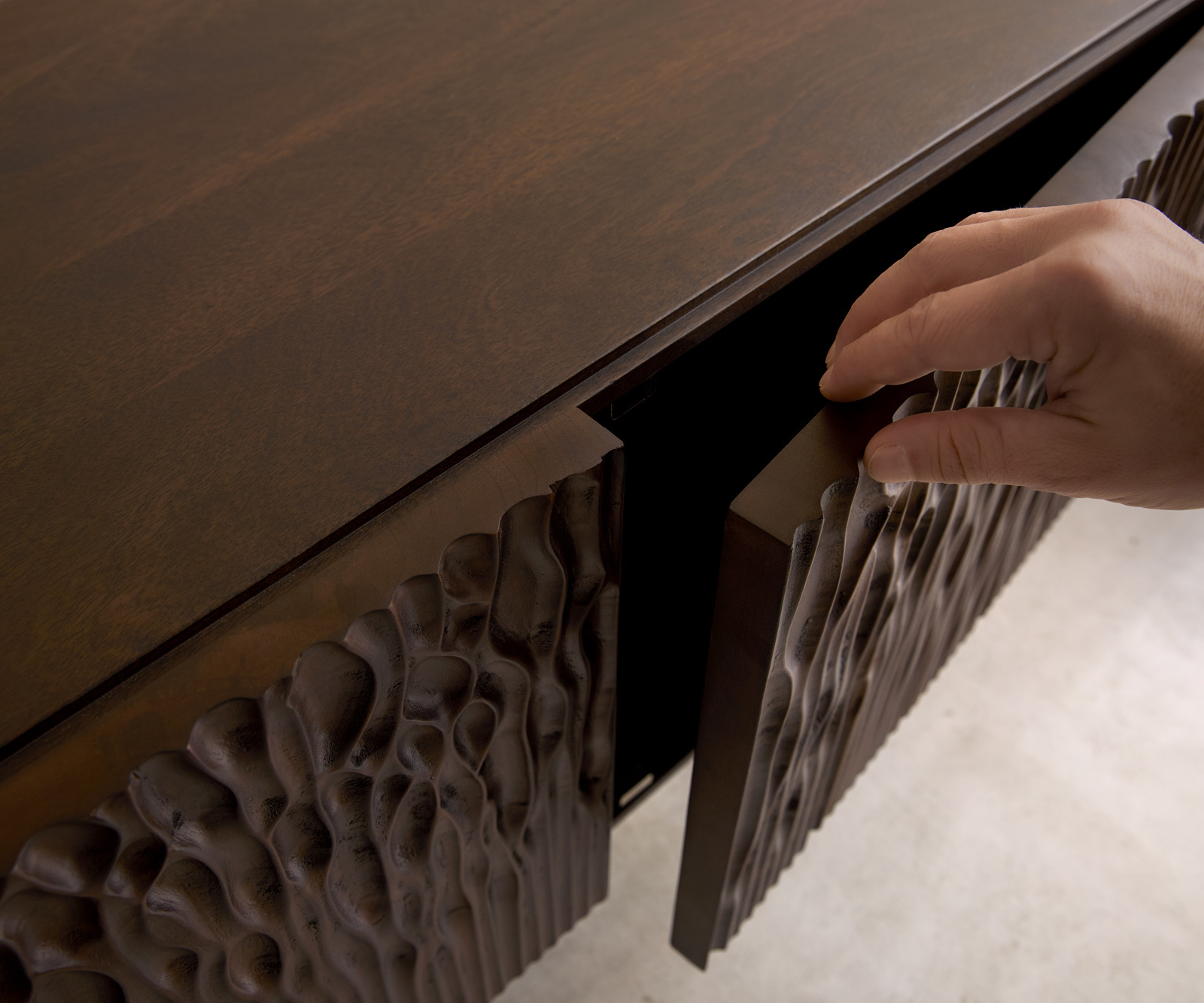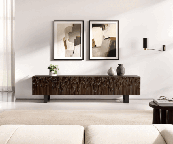 Designový TV stolek Follia s podnoží z černého kovu je silným vyjádřením moderní přirozenosti. Frézovaná přední strana z tmavého mangového dřeva nadchne svou hloubkou a jemnými světelnými efekty, které každou kresbu dřeva oživují. Na matně černé podnoži vzniká zajímavý kontrast mezi ušlechtilým přírodním materiálem a městským designem – ideální pro moderní, stylové bydlení.