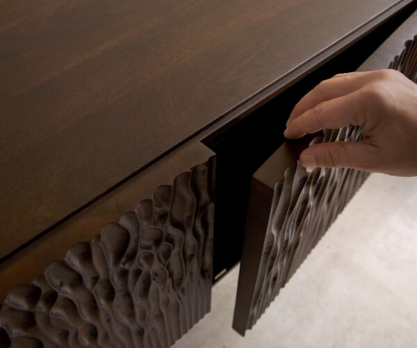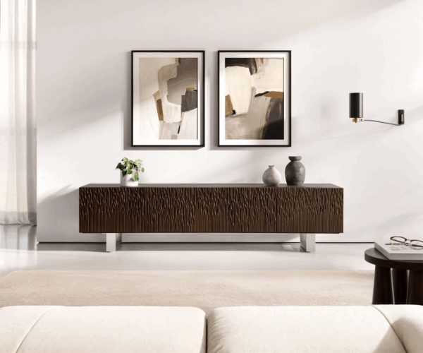Designový TV stolek Follia s podnoží z kartáčované nerezové oceli spojuje řemeslnou dokonalost s nadčasovou elegancí. Frézovaná přední část z tmavého mangového dřeva zaujme svou hloubkou a živostí. Na jednoduchých podnožích z nerezové oceli působí masivní korpus lehce a moderně zároveň. Follia je prohlášením pro všechny, kteří oceňují přírodní materiály v čistém, moderním designu.