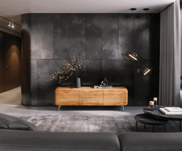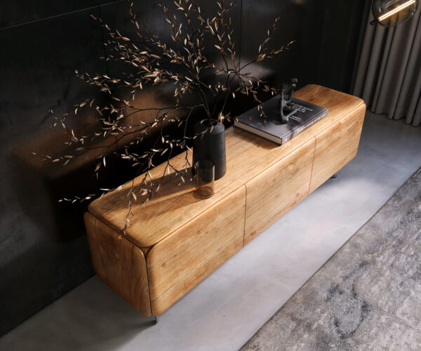 Řada Shavani z kolekce Akácie kombinuje přírodní materiály s jasným, moderním tvarem. Oválné stříbrné nohy z nerezové oceli lehce zvedají TV stolek od podlahy a opticky zvětšují a odlehčují prostor. Tento designový klenot spojuje ušlechtilé řemeslné zpracování s funkční strukturou a dokonale zapadá do každého stylového obytného prostředí.