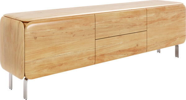 TV stolek z akácie v přírodní barevné variantě přináší díky svému elegantnímu vzhledu a promyšlenému designu nádech rafinovanosti do tvého obývacího pokoje. Zvláště zaoblené hrany po celém obvodu, které jsou vyrobeny náročnou ruční prací, dodávají TV stolku harmonický a jemný tvar. Tento výrazný stylový prvek zdůrazňuje moderní design a dává nábytku jeho jedinečný charakter. Se dvěma dvířky a dvěma zásuvkami nabízí dostatek úložného prostoru pro tvá mediální zařízení a každodenní předměty.