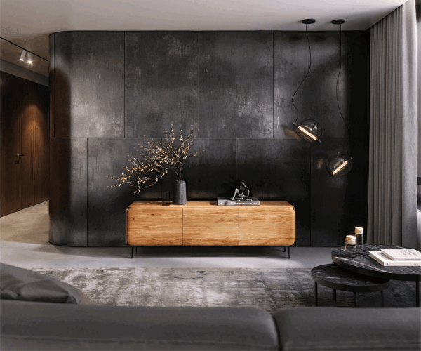 Řada Shavani z kolekce Akácie kombinuje přírodní materiály s jasným, moderním tvarem. Jemné černé kovové nohy lehce zvedají TV stolek od země a opticky zvětšují a odlehčují prostor. Tento designový klenot spojuje ušlechtilé řemeslné zpracování s funkční strukturou a dokonale zapadá do každého stylového obytného prostředí.