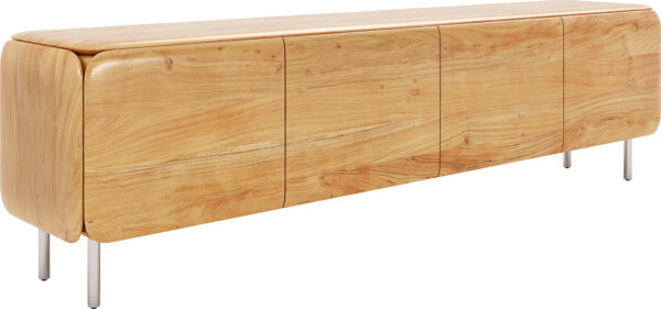 Tento elegantní TV stolek z akáciového dřeva v přírodní barvě přináší díky svému stylovému designu a kvalitnímu zpracování nadčasovou krásu do tvého obývacího pokoje. Teplá kresba dřeva a zaoblené hrany, které jsou vyrobeny s jemnou ruční prací, dodávají nábytku měkký, harmonický vzhled. Čistý design se bez námahy začlení do moderních stylů bydlení, zatímco čtyři dvířka nabízejí dostatek úložného prostoru pro tvá mediální zařízení a každodenní předměty.