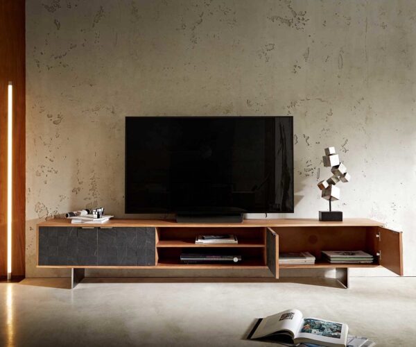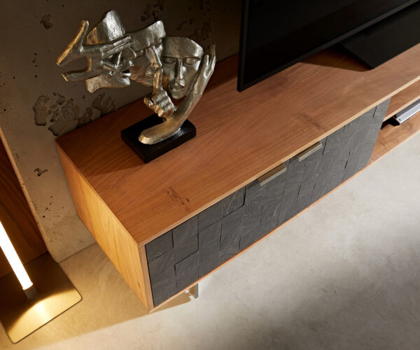 Vkusná kombinace různých charakteristických materiálů činí z elegantního TV stolku ze série Teele atraktivní dominantu obývacího prostoru. Zde se setkává korpus z kvalitně zpracovaného masivního dřeva s dekorativními mozaikovými aplikacemi z břidlice a robustní, lesklou podnoží z nerezové oceli. Různé barvy poutavě zvýrazňují atraktivní rozdíly jednotlivých materiálů.
