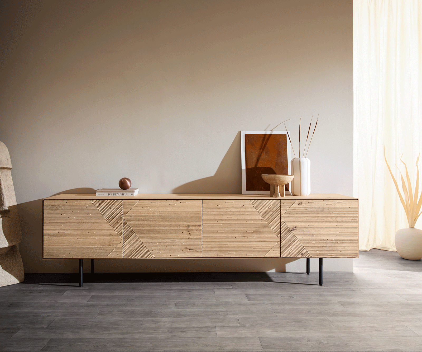 Designový TV stolek Tereos z ušlechtilého dubu přírodní barvy spojuje moderní design s výjimečnými detaily. Zvlášť výrazné jsou 3D frézované přední plochy, které každému obývacímu prostoru dodávají exkluzivní nádech. Za čtyřmi dvířky se nachází prostorný úložný prostor, který je díky kování Soft-Close a Push-to-Open zvlášť pohodlný na používání. Integrovaný průchod pro kabely udržuje vše v pořádku. Černé kovové kulaté nohy vytvářejí stylové akcenty a zajišťují současnou eleganci.