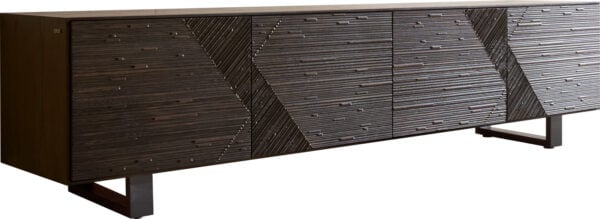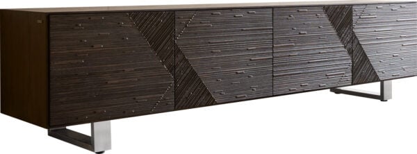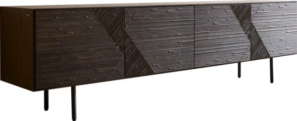 Tmavě hnědý TV stolek Tereos z ušlechtilého jasanového dřeva nadchne umělecky frézovanou 3D přední stranou, která tvému obývacímu pokoji dodá strukturu a hloubku. Čtyři dvířka nabízejí prostorný úložný prostor s technikou Soft-Close a Push-to-Open pro maximální komfort ovládání. Praktický průchod pro kabely navíc zajišťuje uklizený vzhled. Transparentní akrylové nohy vytvářejí fascinující závěsný efekt a dodávají nábytku mimořádně elegantní lehkost.