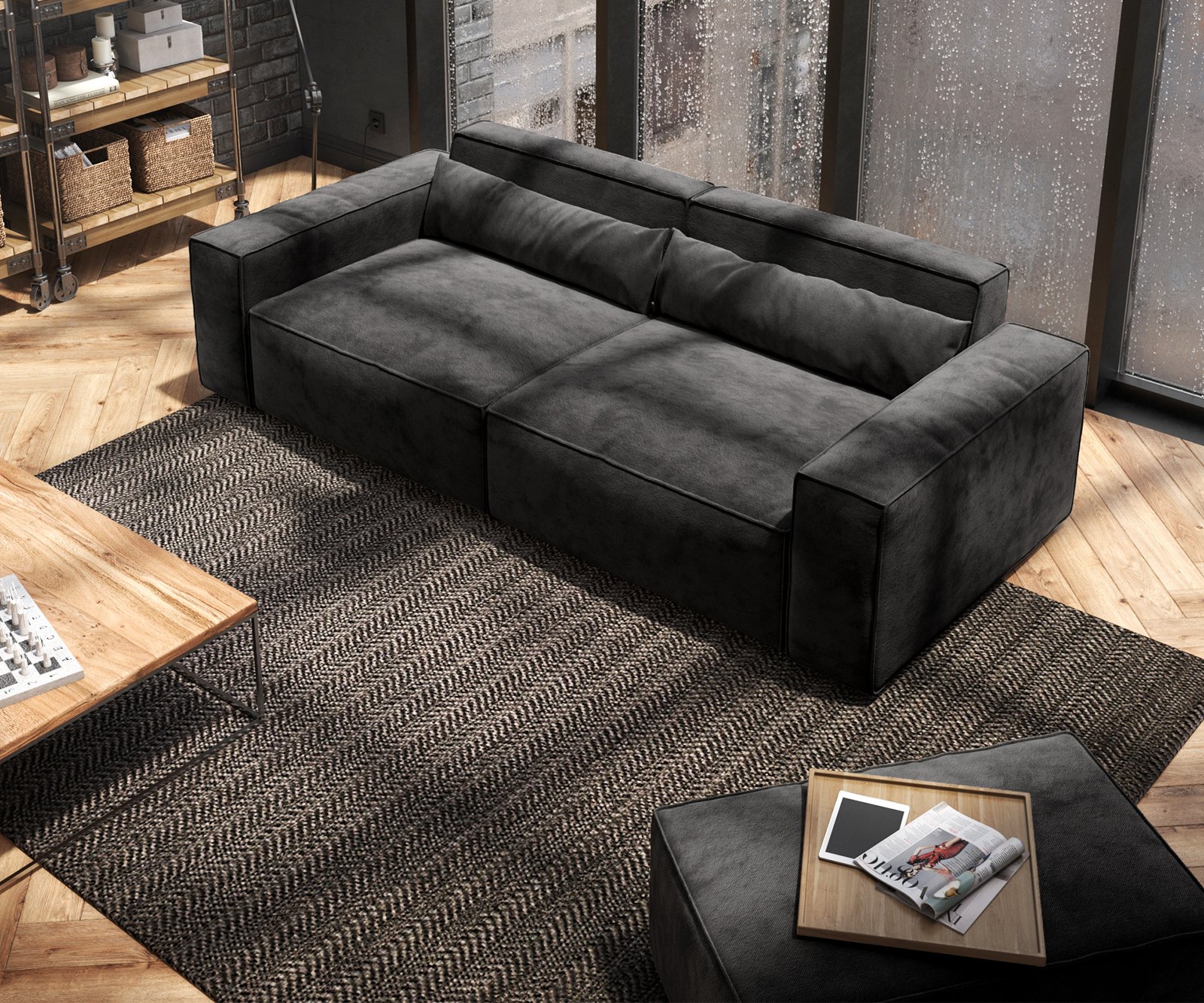 Impozantní pohovka XL Sirpio díky svému přímočarému obdélníkovému designu, který nevyžaduje žádné rušivé nohy, nabízí obzvlášť moderní vzhled, jenž každému prostoru dodává sofistikovaně luxusní atmosféru. Moderní lemování svědčí o mimořádně kvalitním a detailně propracovaném zpracování tohoto elegantního kusu nábytku. Prostorná pohovka XL disponuje hlubokým sedákem pro pohodlné sezení a díky potahu na zadní straně lze pohovku volně umístit do prostoru. Součástí dodávky je také taburet, který poskytuje další pohodlnou plochu na ležení. Taburet lze však výborně využít i jako další sedací místo nebo praktickou odkládací plochu.